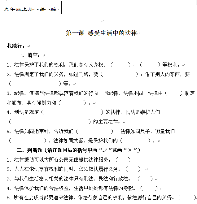 【部编版】2019年秋六上道德与法治:一课一练全集(Word版书稿,含答案)